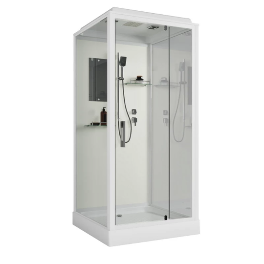 поддон 15 см, распашная дверь, металлические петли, задняя стенка белая, латунный 2-х режимный смеситель, 2-х режимная лейка, штанга, 2 стеклянные полочки, пластиковая ручка, зеркало, вентиляционные решетки, сифон с гидрозатвором, экран несъемный