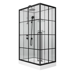 поддон 15 см, раздвижные двери, задняя стенка белая, металлические ролики, латунный 2-х режимный смеситель, лейка, 2 стеклянные полочки, металлические ручки, сифон с гидрозатвором, экран несъемный