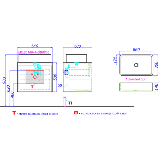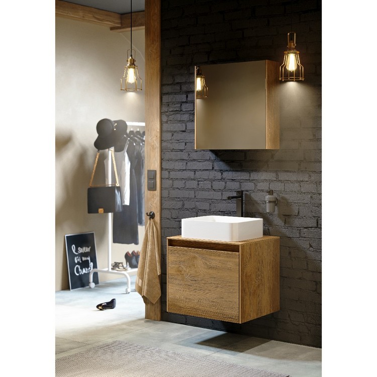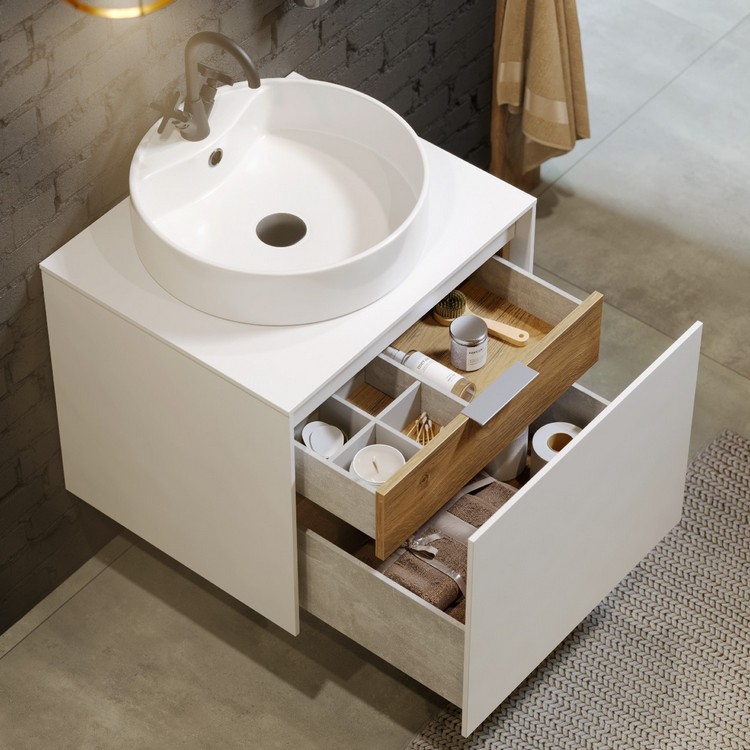 Тумба Mobi 60 оснащена двумя ящиками: основным и внутренним, скрытым за фасадом. Направляющие ящиков обеспечивают плавное и мягкое закрывание. Внутренний ящик тумб укомплектован пластиковым разделителем для хранения различных мелочей. Внутренняя отделка ящиков комбинированная: боковины – цвет бетон светлый, дно – дуб балтийский. В комплект тумбы Mobi входит специальный сифон, позволяющий экономить пространство мебели. Фасады, боковины и столешницы из МДФ толщиной всего 10 мм. Подходит любой наставной умывальник. При этом умывальник может устанавливаться в любом месте, а не только по центру. Коллекция оснащена итальянскими навесами Camar, которые выдерживают нагрузку до 200 кг.