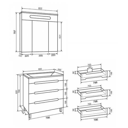 Тумба Olivia 80 оснащена тремя выдвижными ящиками на шариковых направляющих скрытого монтажа с доводчиками. Ящики легко открываются благодаря удобным вырезам на фасаде.