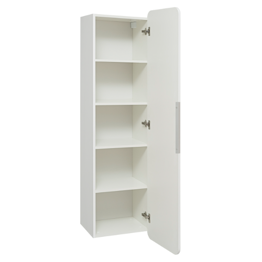 Пенал Skandi оснащен одной распашной дверцей (петли справа). Корпус выполнен из ЛДСП, а фасад - из МДФ. Внутри пенала расположены 4 полки, которые создают достаточно места для хранения всевозможных гигиенических принадлежностей и бытовой химии. Дверца мягко и плавно закрывается благодаря петлям с доводчиком. Пенал выпускается только в правом исполнении. Лаконичным завершением общей композиции является стильная хромированная ручка.