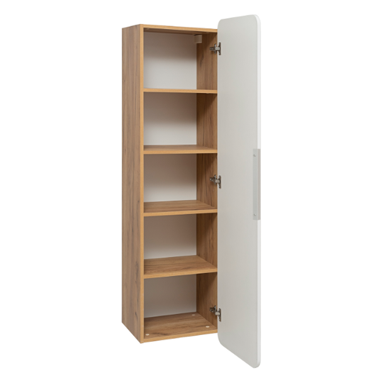 Пенал Skandi оснащен одной распашной дверцей (петли справа). Корпус выполнен из ЛДСП в древесной текстуре "дуб крафт золотой", а фасад - из МДФ в белой глянцевой эмали. Внутри пенала расположены 4 полки, которые создают достаточно места для хранения всевозможных гигиенических принадлежностей и бытовой химии. Дверца мягко и плавно закрывается благодаря петлям с доводчиком. Пенал выпускается только в правом исполнении. Лаконичным завершением общей композиции является стильная хромированная ручка.