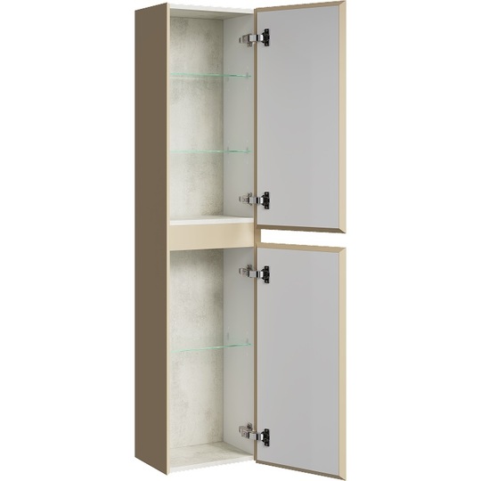 Пенал Aqwella Geometria 35 оснащен двумя дверцами на петлях с мягким закрыванием, внутри расположены полочки. Фасады и боковины с обработкой торцов под углом 45 градусов создают лаконичность и изящный, почти монолитный силуэт в закрытом состоянии. Все грани имеют округлую фрезеровку, обеспечивая приятные тактильные ощущения при открывании. Внутри - отделка под светлый камень.