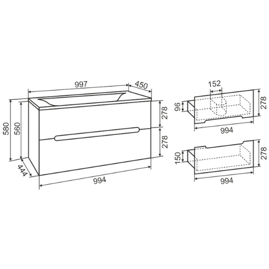 Тумба Olivia 100 оснащена двумя выдвижными ящиками на шариковых направляющих скрытого монтажа с доводчиками. Ящики легко открываются благодаря удобным вырезам на фасаде.