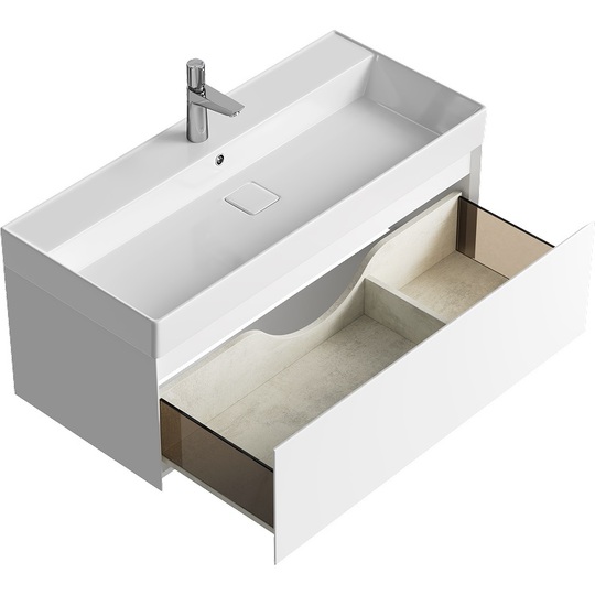 Тумба Aqwella Geometria 100 оснащена одним выдвижным ящиком на направляющих скрытого монтажа, что обеспечивает плавное скольжение и мягкое закрывание. Фасады и боковины с обработкой торцов под углом 45 градусов создают лаконичность и изящный, почти монолитный силуэт в закрытом состоянии. Все грани имеют округлую фрезеровку, обеспечивая приятные тактильные ощущения при открывании. Внутри ящиков - отделка под светлый камень, боковины выполнены из толстого тонированного стекла, что добавляет коллекции элегантности.