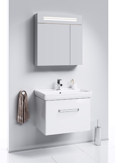 Подвесная тумба Aqwella Нео 70 в белом глянцевом цвете с одним выдвижным ящиком, оснащенным скрытыми направляющими с системой мягкого закрывания. Фасады из МДФ покрыты пятью слоями белой глянцевой эмали, боковины из ЛДСП также окрашены. Гарнитур комплектуется керамическим умывальником чешского производства Dreja Q70 New.